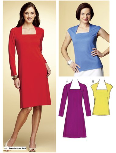Pull-over dress and top have darts at front neckline and front extends to form stand-up collar in back. Front neckline is finished with facing.