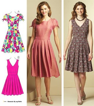 Dresses have fitted bodice with waist inset, center back zipper, and full pleated skirt. View A has wide round neckline, and short gathered sleeves with ties at bottom edge. View B sleeveless dress has wide V-neckline.