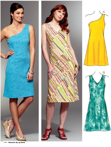 Close fitting pull-over dresses have slightly flared skirt and armholes are finished with narrow hems. View A one shoulder dress has elastic at neckline. View B has V-neckline on front and back finished with narrow self fabric neckband.