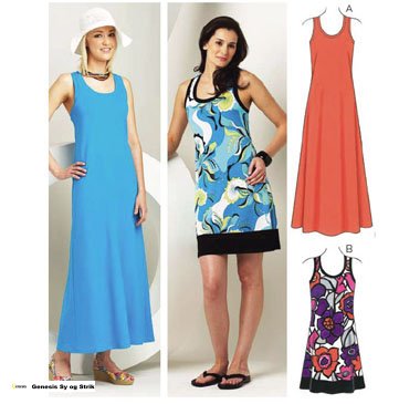 Close fitting pullover dresses have flared skirt, racer back, neckband, and armhole bands. View B has contrast extension at bottom edge, and neckband and armhole bands from contrast fabric.