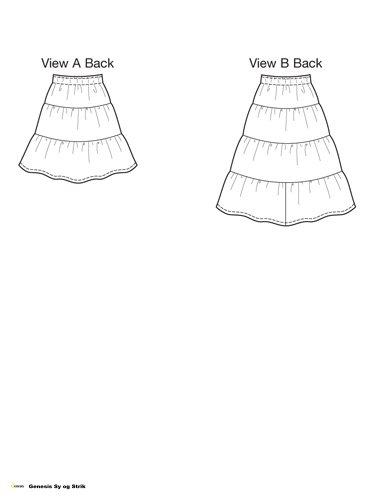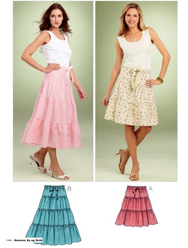 Tiered skirts have ribbon drawstring in casing at waist. View A has three bias cut tiers. View B has three bias cut tiers and bottom tier is cut on straight grain.