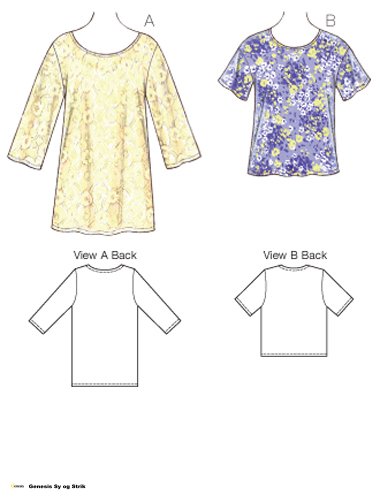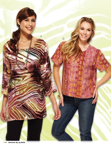 Loose fitting pull-over tops have extended shoulders. View A has wide boat neckline and three-quarter length sleeves. View B has round neckline and short sleeves.
