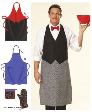 View A Apron has mock vest made from contrast fabric, buttons at center front, button closure at back neck, and patch pockets. View B Apron has patch pockets, and adjustable neck strap with D-rings.
