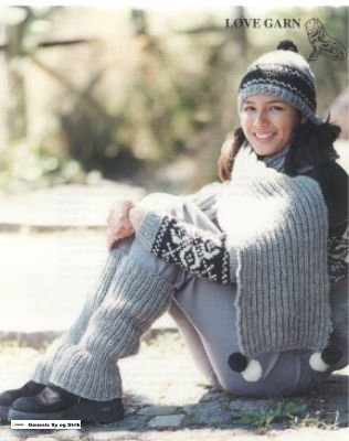 Halstørklæde: 400 g mellemgrå en rest sort og råhvid til pomponer.