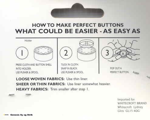 Du klipper et stykke stof efter medfølgene skabelon, lægger stoffet i holderen, folder det lidt ind, sæt de 2 sidste dele over og klem og du har en perfekt knap.