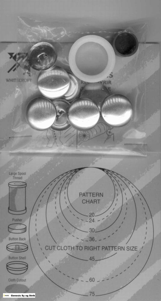 Du klipper et stykke stof efter medfølgene skabelon, lægger stoffet i holderen, folder det lidt ind, sæt de 2 sidste dele over og klem og du har en perfekt knap.