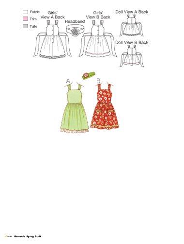 Girls' Dresses have lined bodice, gathered shoulder straps, square neckline, gathered skirt, gathered ties in side seams that tie at back waist, and center back button closure. View A has lined skirt with tulle gathered to lining that extends below bottom edge of skirt. Headband from knit fabric has flower from dress fabric and tulle. View B has patch pockets and decorative trim. Doll Dresses have double bodice, gathered shoulder straps, square neckline, gathered skirt, ties that tie at back waist, and back Velcro® closure. View A has tulle gathered to skirt that extends below bottom edge. Headband from knit fabric has flower from tulle. View B has pockets and decorative trim.