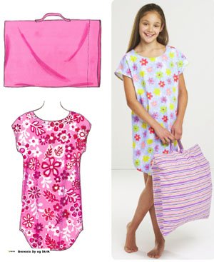 Girls' loose fitting sleep shirt has round neckline finished with facing and shaped hemmed bottom. Front and back extend to form cap sleeves. "Take along"pillowcase has handle and fits standard size pillow. Sleep shirt and pillowcase are very easy to make and have special easy-to-follow sewing instructions.