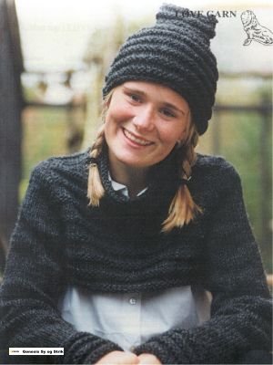 Pinde: Jumper- og rundpinde 40 cm nr. 7 og strømpepind nr. 7 til hue.