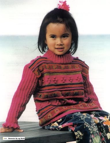 Garn: Løve Baby og Hosegarn fra HP Garn: 3 (3) 4 (4) ngl. pink fv. 14, 1 ngl. bordeaux fv. 17, støvet rosa fv. 16, rust fv. 40, blåmeleret fv. 06 og mørk lime fv. 171.