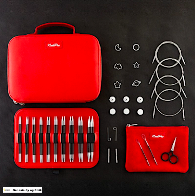 Sættet leveres i en flot rød taske med håndtag.
