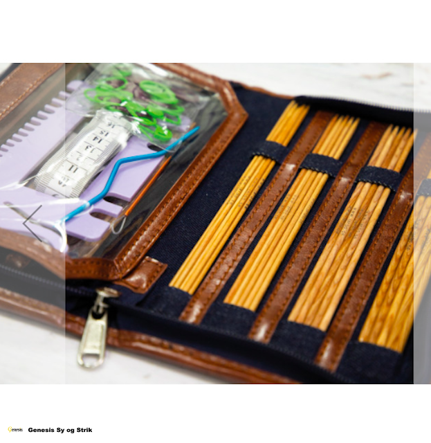 Tilbehør: Uldnål 2.25 mm, Snoningspind 2.50 mm, Maskemarkører (30 stk), Pindemål med indbygget kniv og et målebånd.