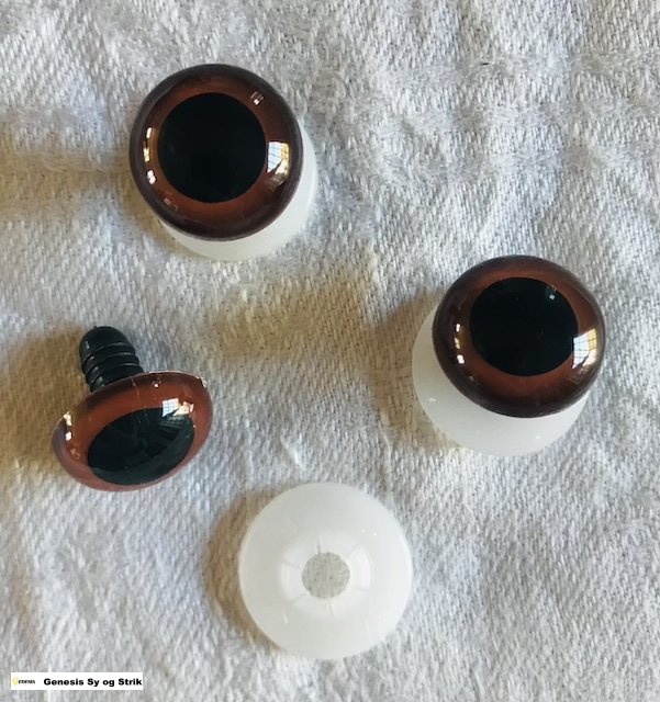 Knap i plast udformet som et brunt øje med sort pupil.